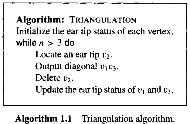这意味着,在耗时的初始化步骤之后,每次迭代只需调用两次 Diagonal 函数即可更新耳尖状态信息。由此可得到Algorithm 1.1 中所示的用于构建三角剖分的伪代码。
