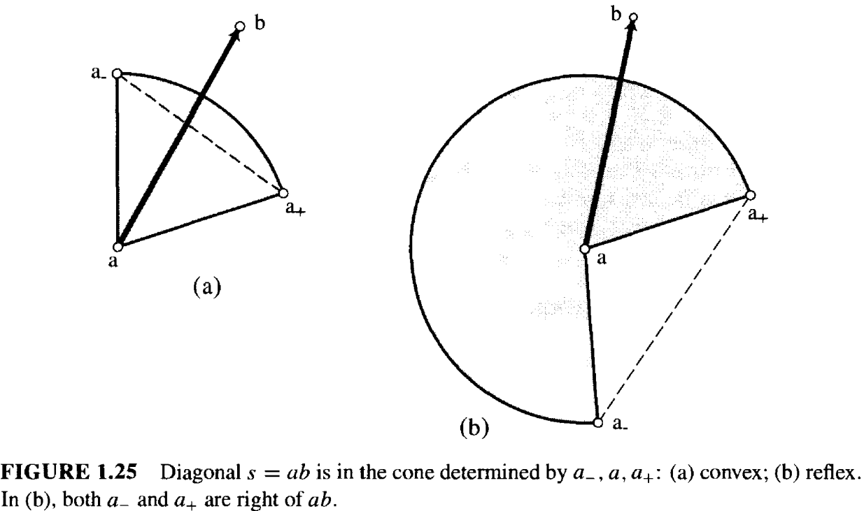 图 1.25(a) 展示了凸角的情况。当且仅当 \(s\) 的一个端点位于顶点 \(a\) 处并且在与 \(a-, a+\) 构成的圆锥内部,\(s\) 才在 \(P\) 的内部。 我们可以通过函数 Left 轻松搞定: \(a-\) 必须在 \(ab\) 的左侧,\(a+\) 必须在 \(ba\) 的左侧。 这两个左侧的判定都必须严格的,以避免 \(ab\) 与圆锥边界共线重叠的情况。