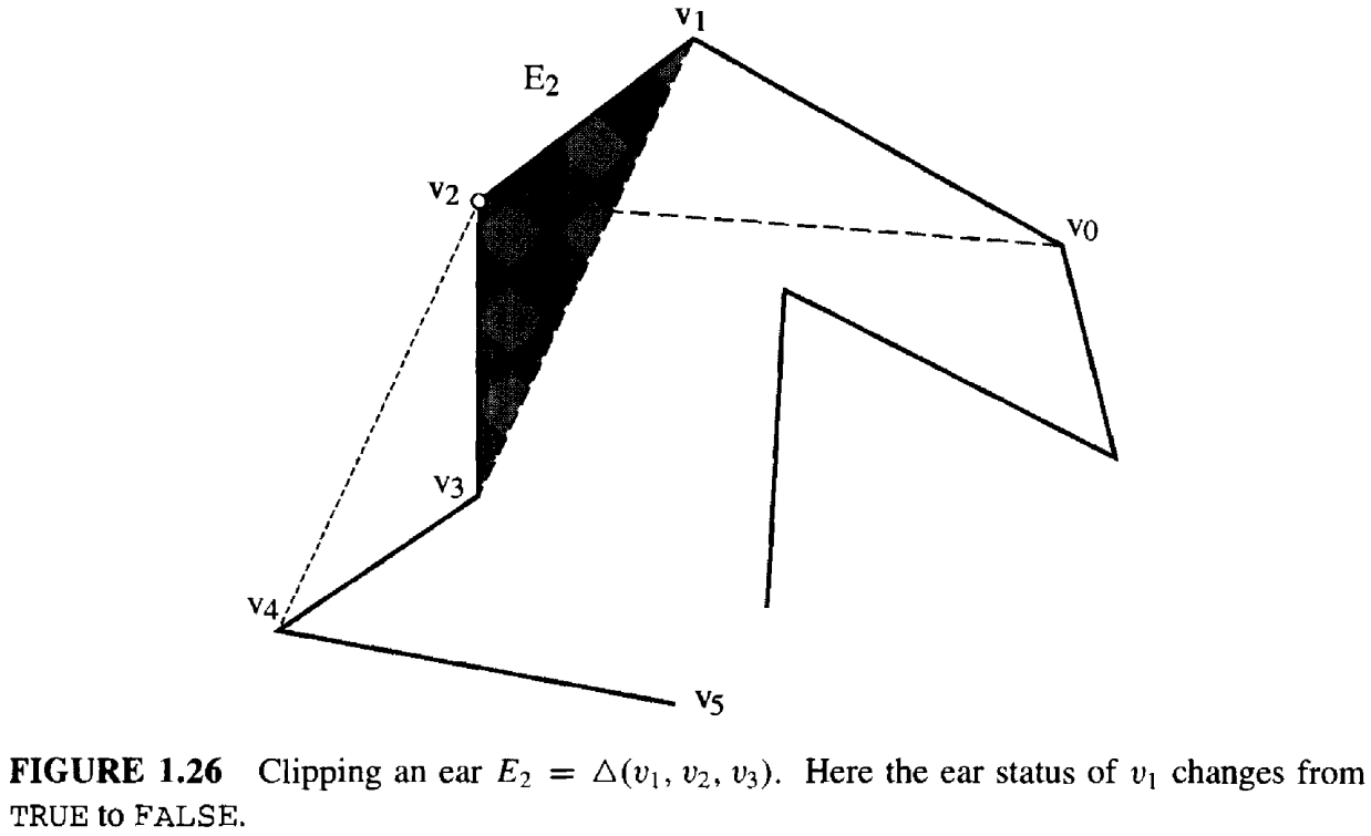其中 \(v_2\) 是潜在的耳朵尖。一旦找到耳朵尖,就通过调用函数 Diagonal 更新 \(v_1\) 和 \(v_3\) 的耳朵状态,打印代表耳朵根的对角线,并将耳朵从多边形中移除。