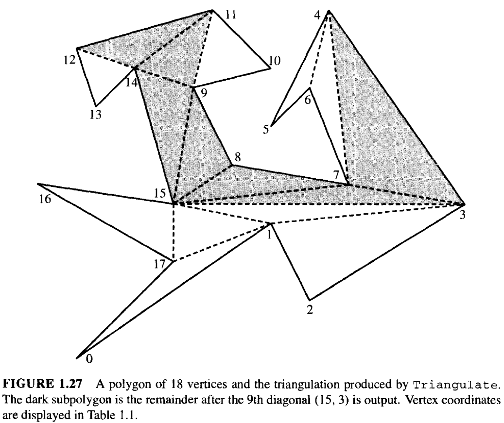 现在来看一下,本例中对角线的输出结果,如表 1.2 所示。\(v_0\) 是耳尖,因此第一个对角线输出为 (17, 1)。 \(v_1\) 不是耳尖,所以指针 v2 移动到 \(v_2\)。\(v_2\) 是一个耳尖,输出对角线 (1, 3)。 \(v_3\) 和 \(v_4\) 都不是耳尖,直到 \(v_5\) 时才输出下一个对角线 (4, 6)。线段 \(v_3v_8\) 与 \(v_7\) 共线,因此下一个耳朵要到 \(v_{10}\) 才能找到。 图 1.27 中深色阴影的子多边形显示了输出第 9 条对角线 (15, 3) 后剩余的多边形。另外,\(v_9\) 与 \(v_{11}v_{15}\) 共线,因此在移除对角线 (15, 9) 后,\(v_9\) 不再是耳朵。