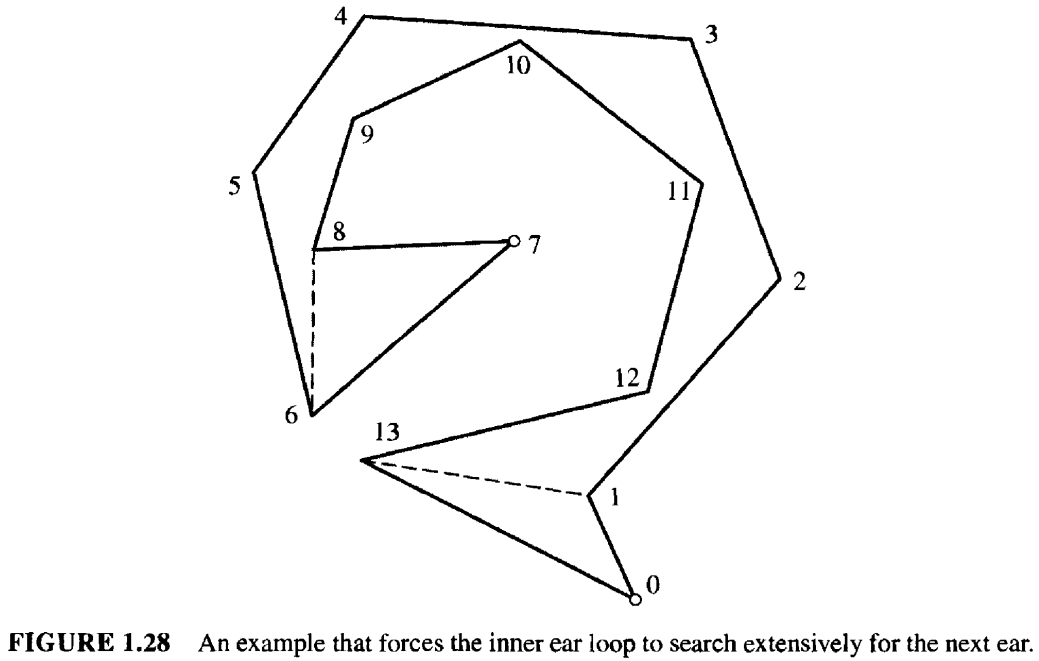 如图 1.28 所示。删除 \(v_0\) 后,内循环需要搜索 \(v_1, \cdots, v_6\) 才能找到下一个耳尖 \(v_7\)。然后,它必须搜索 \(v_8, \cdots, v_{12}\) 才能找到耳尖 \(v_{13}\)。 这个例子表明,内循环确实可能需要迭代 \(n\) 次才能找到一只耳朵。但请注意,循环内的两个 \(O(n)\) 的函数 Diagnal 仅在找到一只耳朵后才需要调用——它们并非在每次迭代中都调用。 因此,尽管表面上其复杂度为 \(n × n × n = O(n³)\),但实际上它是 \(n × (n + n) = O(n²)\) 的。