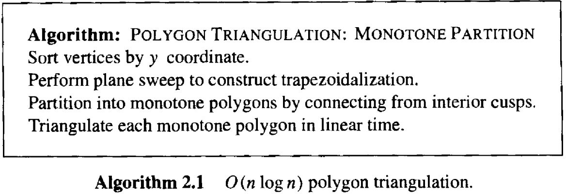 省略其余(主要是数据结构)细节,我们在算法 2.1 中总结了复杂度为 \(O(n \log n)\) 的多边形三角分割的算法。