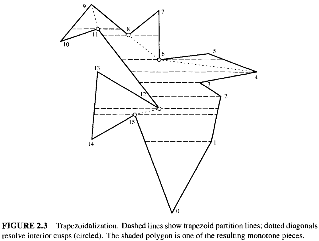 假设 \(P\) 是一个任意两个顶点都不位于同一水平线上的多边形。那么在水平梯形化中,每个梯形恰好有两个支撑顶点,分别位于其上下两边。 梯形分割与单调多边形之间存在联系,如果一个支撑顶点位于梯形上边或下边内,那么它是一个内部尖点interior cusp。如果将每个内部支撑顶点 \(v\) 都与其所支撑的梯形的另一个顶点相连, 向下连接被称为"向下尖点",向上连接为"向上尖点",那么这些对角线将 \(P\) 分割成关于垂直方向的单调多边形。这由引理 2.1.1 得出,因为每个内部尖点都被这些对角线移除。 例如,图 2.3 中的向下尖点 \(v_6\) 会被对角线 \(v_6v_4\) 消除。连接向下尖点 \(v_{12}\) 就可以消除向上尖点 \(v_{15}\),等等。