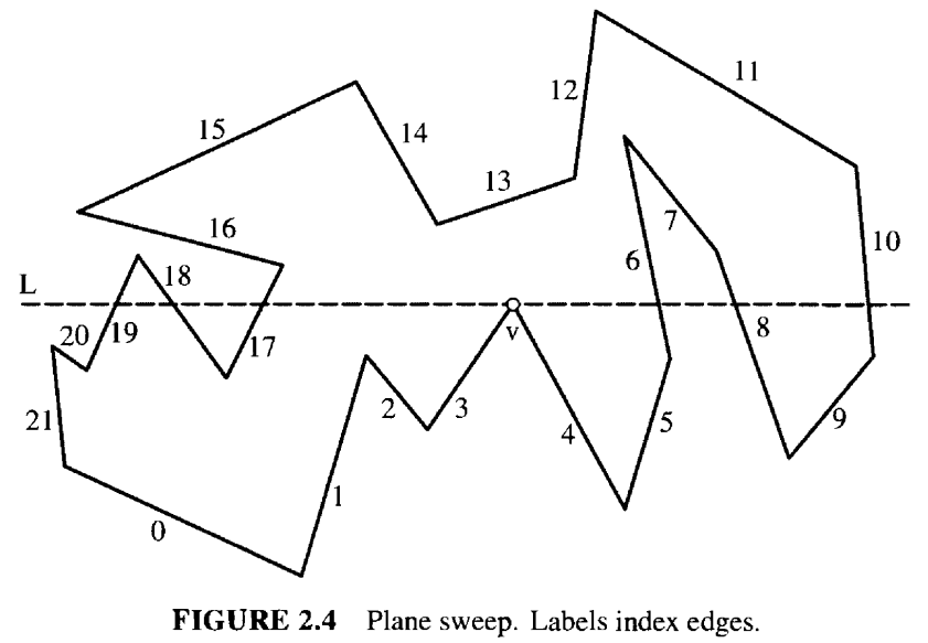 我们用于一种基于"平面扫描Plane Sweep" 或者"扫描线Sweep line" 的技术实现梯形化。该技术在许多几何算法中都非常有用(Nievergelt & Preparata 1982)。 其主要思想是用一条直线扫描一个平面,沿该直线维护某种数据结构。扫描过程中会遇到一些离散的“事件”,此时会处理这些事件并更新数据结构。 我们将用水平线 \(L\) 扫描多边形,每遇到一个顶点就会触发一个事件。这需要对顶点按 y 坐标进行排序,对于一般的多边形,需要 \(O(n \log n)\) 的时间复杂度。
