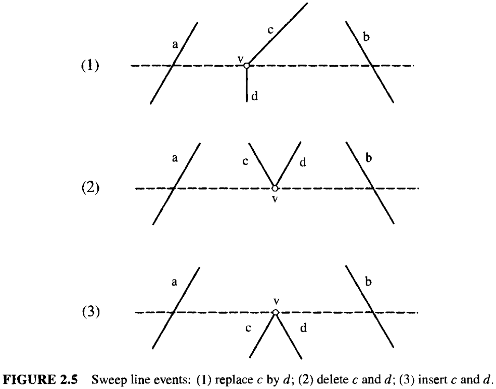 接下来需要证明,我们总是可以维护这个数据结构,并且时间复杂度是 \(O(n \log n)\)。只要数据结构支持 \(O(\log n)\) 时间复杂度的插入和删除操作,那么这一点就很容易实现, 例如平衡树、2-3树或红黑树就支持这种操作。现在,我们假设有一条向下的扫描线,来详细研究一下每次事件的更新过程。