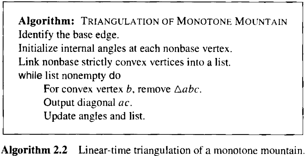 引理 2.3.1 给出了单调山三角分割的近乎线性的算法。找到一个不在底边的凸顶点,剪掉相关的耳朵,然后重复。