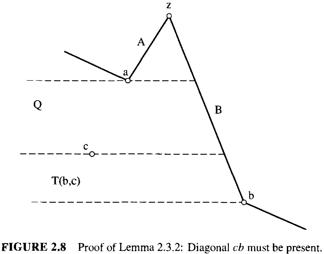 假设相反的情况,存在切块 \(Q\) 的两个单调链 \(A\) 和 \(B\) 都至少包含两条边。设 \(z\) 是 \(Q\) 的最顶端顶点,在 \(\partial Q = A \cup B\) 上与顶点 \(a \in A\) 和 \(b \in B\) 相邻, 并且 b 位于 a 的下方。参见图 2.8。为了使 \(B\) 包含的边不止 \(zb\),那么 \(b\) 就不能是分割对角线的端点。考虑由顶点 \(b\) 从下方支撑的梯形 \(T(b, c)\)。 它的上支撑顶点 \(c\) 不能位于 \(zb\) 上,因为 \(c\) 必须位于 \(a\) 处或 \(a\) 的下方。因此,在 \(T(b, c)\) 中 \(b\) 与 \(c\) 不会在同一侧,对角线 \(cb\) 包含在 \(Q\) 中, 这与 \(B\) 延伸到 \(b\) 下方的假设相矛盾。□