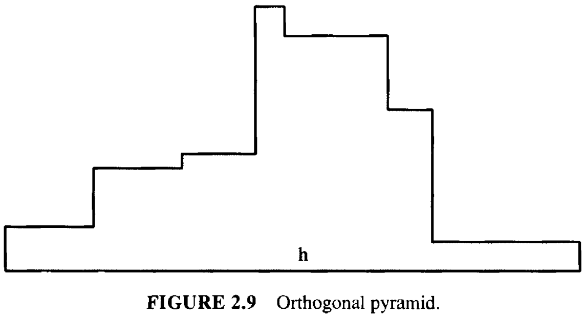 正交金字塔(orthogonal pyramid) \(P\) 是一个关于竖直方向单调的正交多边形,它包含一条水平边 \(h\),该水平边的长度等于所有其他水平边的长度之和。 因此 \(P\) 在竖直和水平方向都是单调的。实际在水平方向上,它是一座单调的山。如图 2.9 所示,\(P\) 由两个连接到水平边 \(h\) 的"阶梯"组成。