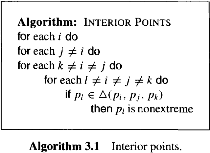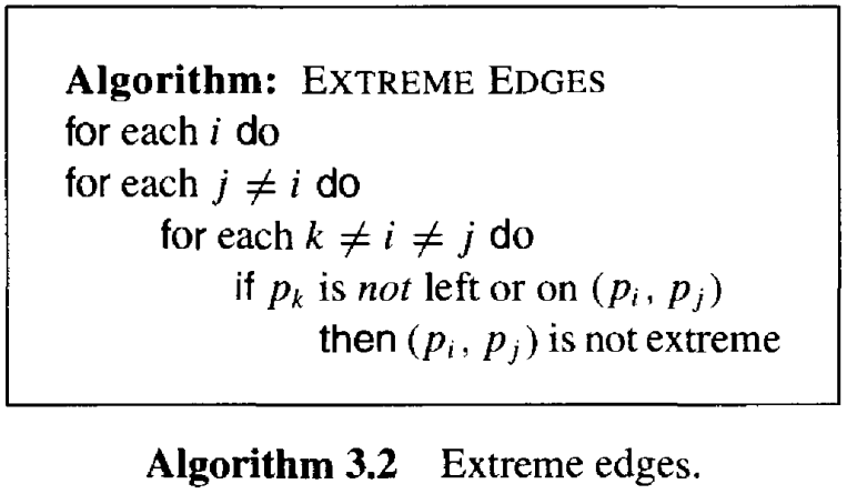 我们选择不在下面检查这个确切的条件(因为我们只是为了改进这个算法而探讨这个算法的框架)。因此,算法 3.2 只针对"一般位置(in general position)"的点集输出极点,其中没有三点共线。 显然该算法的时间复杂度为 \(O(n^3)\),因为它有三个嵌套循环,每个循环的时间复杂度为\(O(n)\)。对于 \(n^2\) 对点中的每一对,极边测试的时间复杂度为 \(n\)。 现在可以很容易地找到哪些顶点是极端点(在一般位置假设下),因为极点是极边的两个端点。