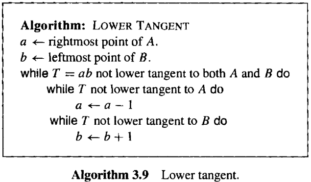 Preparata & Hong 的思路是,从连接 \(A\) 的最右点到 \(B\) 的最左点的直线 \(T\) 开始,然后向下"行走(walk)",先沿着一个凸包前进,再沿着另一个凸包前进,交替进行,直到到达下切线。 参见图 3.11。伪代码见算法 3.9。注意,\(a-1\) 在 \(A\) 上是顺时针方向,\(b+1\) 在 \(B\) 上是逆时针方向,两者都表示向下移动。如果 \(a-1\) 和 \(a+1\) 都位于 \(T\) 的上方, 则 \(T = ab\) 是 \(a\) 点的下切线。这等价于说这两个点都在 \(a\) 的左侧或上方。类似的定义也适用于 \(B\) 的下切线。为了便于阐述,我们假设直线总是相切于某一点,而不是相切于某一边。