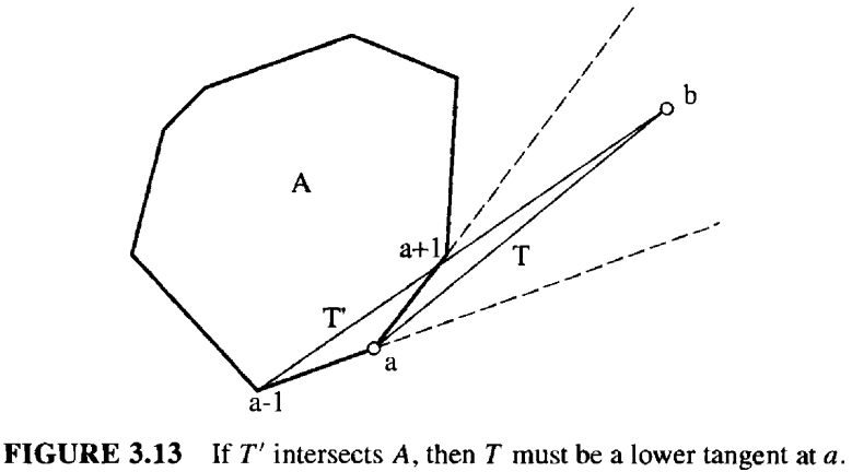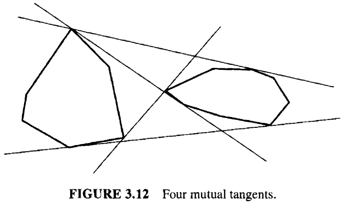 - 实际有四条切线,如图 3.12 所示,按照前述算法,最终应该只找到其中一条,即左侧同时支撑 \(A\) 和 \(B\) 的那条切线。