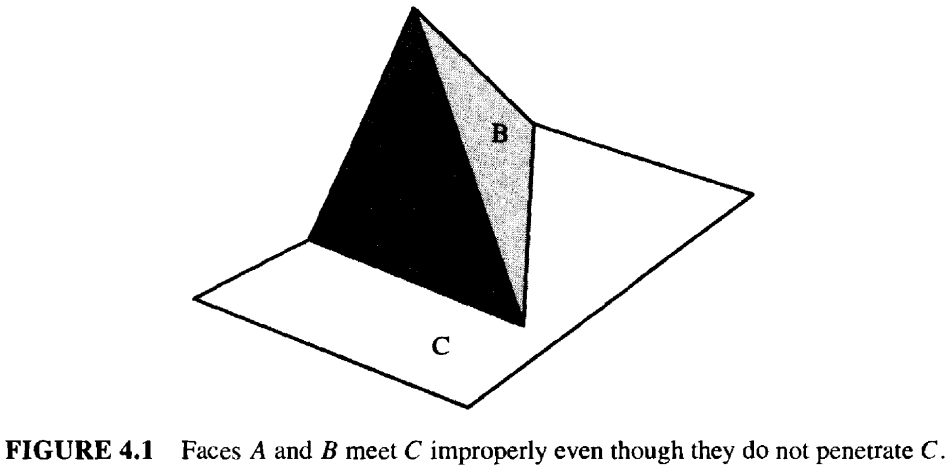 (c) 它们有两个公共顶点,并且连接这两个顶点的边也相同。这里,假设面是凸面,简化了条件。非正常相交不仅包括穿透面,还包括以"错误"方式接触的面,参见图 4.1。 我们无需指定边和顶点相交的条件,因为面的条件也涵盖了它们。因此,一对边的非正常相交意味着一对面的非正常相交。