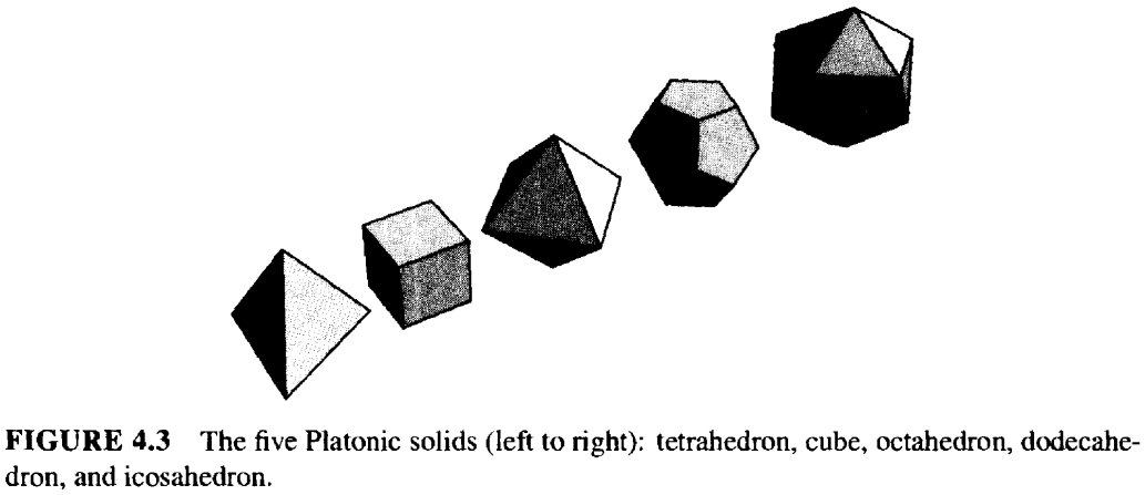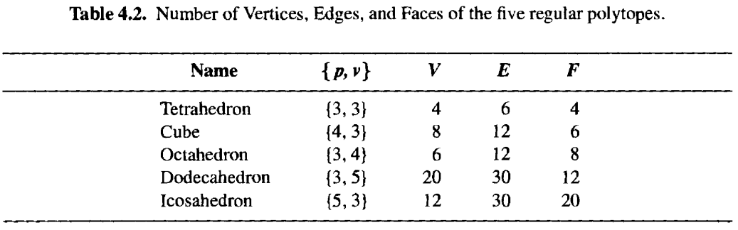 表中所列的 \(p,v\) 取值的组合,为何能得出所声称的对象,这一点并不那么显然。这些数值提供的是局部信息,需要从中推断出全局结构。 在此我们不赘述这一推断过程。只需观察图 4.3 中的五个多面体,即可迅速发现它们符合 \(\{p, v\}\) 值。统计顶点数、边数和面数,即可得到表 4.2 中的数值。 名称中的希腊语前缀指的是面的数量: tetra = 4,octa = 8,dodeca = 12,icosa = 20。有时立方体(cube)也被称为"六面体 hexahedron"!