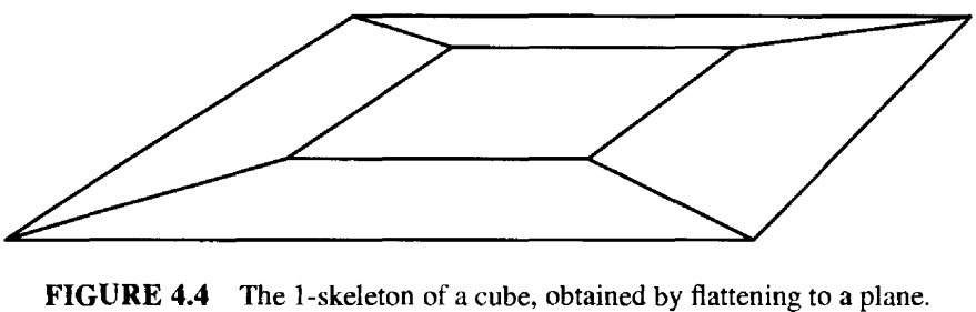 假设多面体由一种柔性材料制成,我们首先将多面体表面 \(P\) "展平"到一个平面上,可能会产生相当大的变形。 选择 \(P\) 的任意一个面 \(f\) 并将其移除,这会在表面上留下一个孔。现在,将这个孔不断拉伸,直到它远大于 \(P\) 的原始尺寸。 直观上应该可以理解,我们可以将该表面展平到平面上,从而得到一个平面图 \(G\),即,多面体的 1-骨架(1-skeleton)。它是一个嵌入平面且边无交叉的图,其节点源自 \(P\) 的顶点, 其弧源自 \(P\) 的边。\(f\) 的边成为了 \(G\) 的外边界。除 \(f\) 之外的 \(P\) 的每个面都对应 \(G\) 的一个有界面,\(f\) 则是 \(G\) 的外部无界面。 展平后的立方体如图 4.4 所示。因此,如果我们把图 \(G\) 的这个外表面算作一个真正的面,那么多面体 \(P\) 的顶点、边和面就与图 \(G\) 的顶点、边和面一一对应。 我们可以基于该平面图证明欧拉公式。