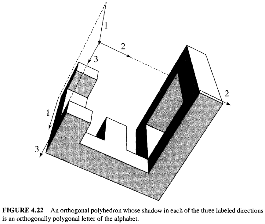- 给定三个正交多边形,设计一个算法来计算一个形状,其影子就是这些多边形,见图 4.22,或者报告不存在这样的形状。 尽量在高层面上描述算法,关注方法而非实现细节。分析算法的时间复杂度,写出关于多边形顶点数 \(n\) 的函数,假设它们都有大致相同数量的顶点。 讨论你的算法是否可以修改以处理非正交多边形;也许它不能。