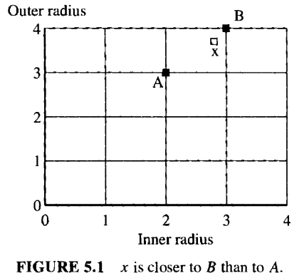 假设一个视觉系统聚焦于箱子里的一个螺母 \(x\),并测得其内径和外径分别为 2.8 和 3.7 厘米。考虑到存在测量误差,且箱子里只有A类和B类螺母,那么 \(x\)属于哪种螺母呢? 它极有可能是一颗 B 类螺母,因为它在特征空间中与 B 的距离是 0.36,而与 A 的距离是 1.06。参见图5.1。换句话说,\(x\) 的最近邻是B,因为\(x\)位于B的维诺多边形内。
